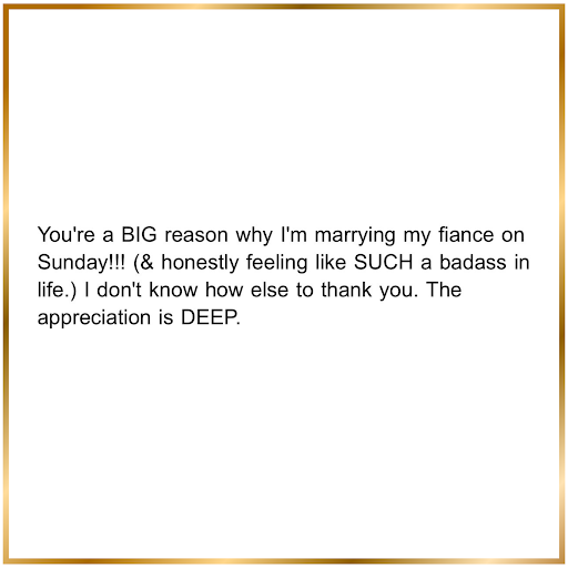 "I'm so grateful to Samara. She had a way with helping me that led to amazing breakthroughs. In thirty days we got engaged! I was able to move through things that were groundbreaking, giving us a marriage that I couldn't even dream of.